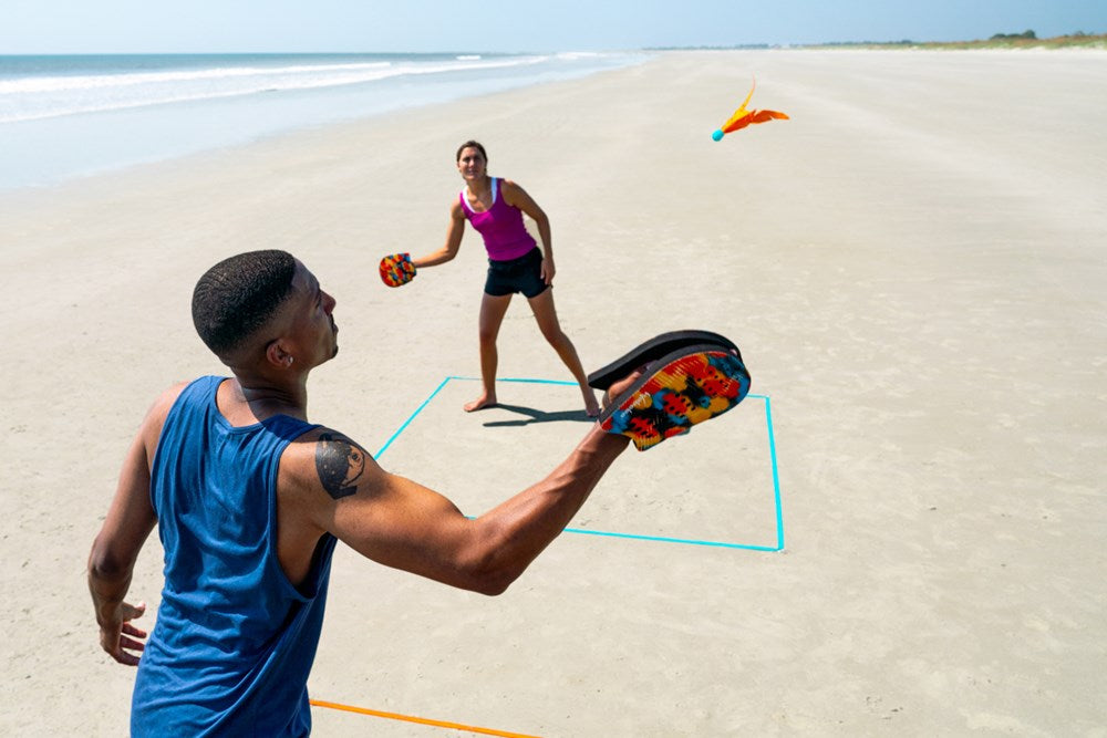 The two player game you never knew you needed! Introducing Battlebird! A two player game featuring VOLI hand paddles, a new fast spinning birdie, and ground court straps. Score points by hitting the birdie into your opponents square. Play in the backyard, park, or beach.