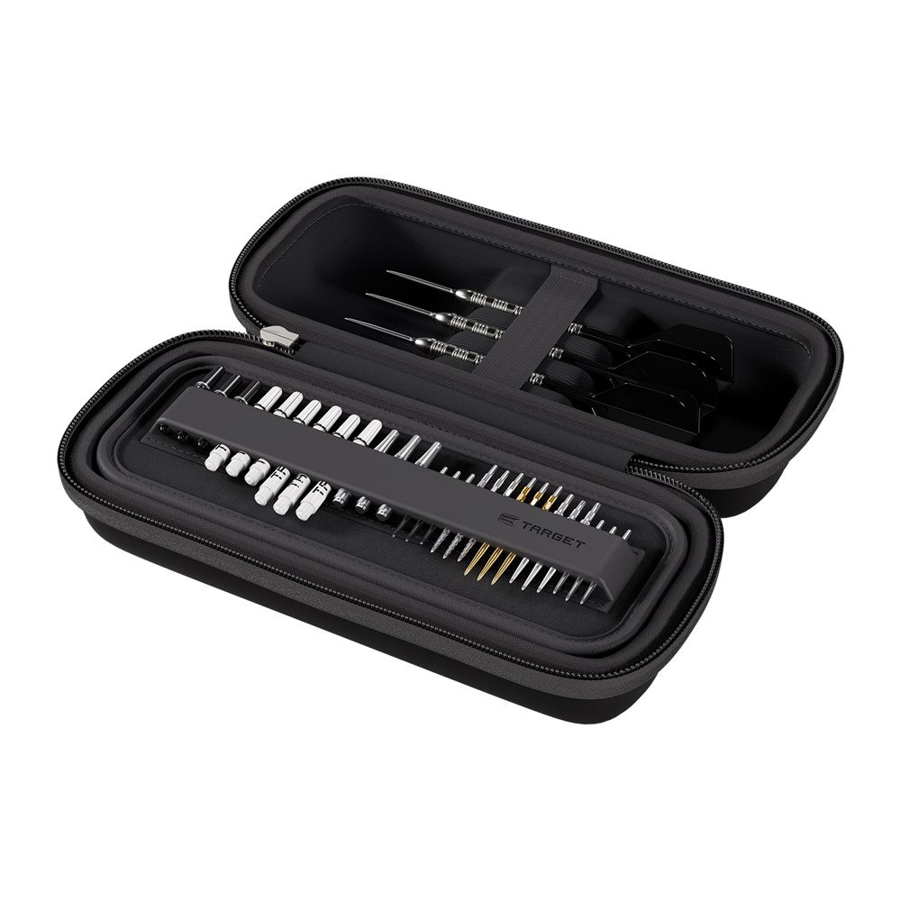 The case comfortably houses up to 6 fully assembled darts, eliminating the need to disassemble your setup between games. An internal tray system allows storage for 12 dart shafts and 15 Swiss Point tips, while additional compartments provide space for flights, K-Flex accessories, Swiss Point tools, and other essentials.