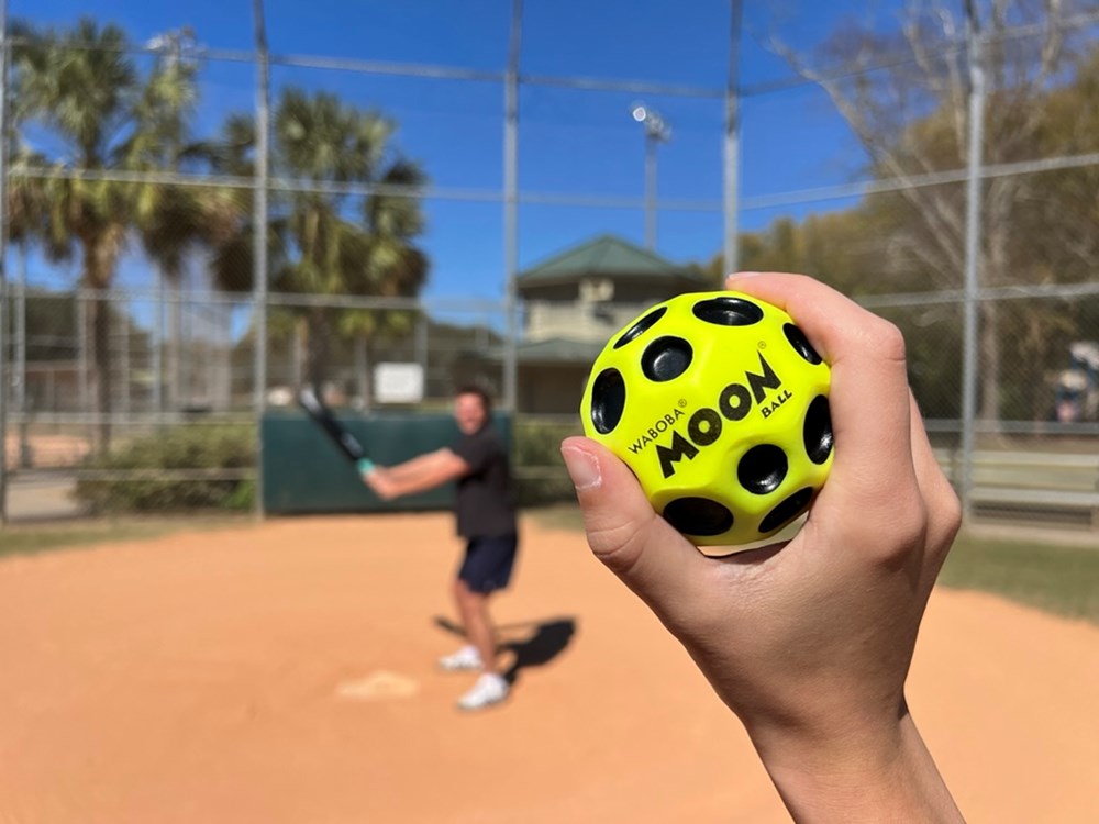 - The Moon Ball makes a unique “pop” sound when it hits the pavement and bounces up to 30 meters high!