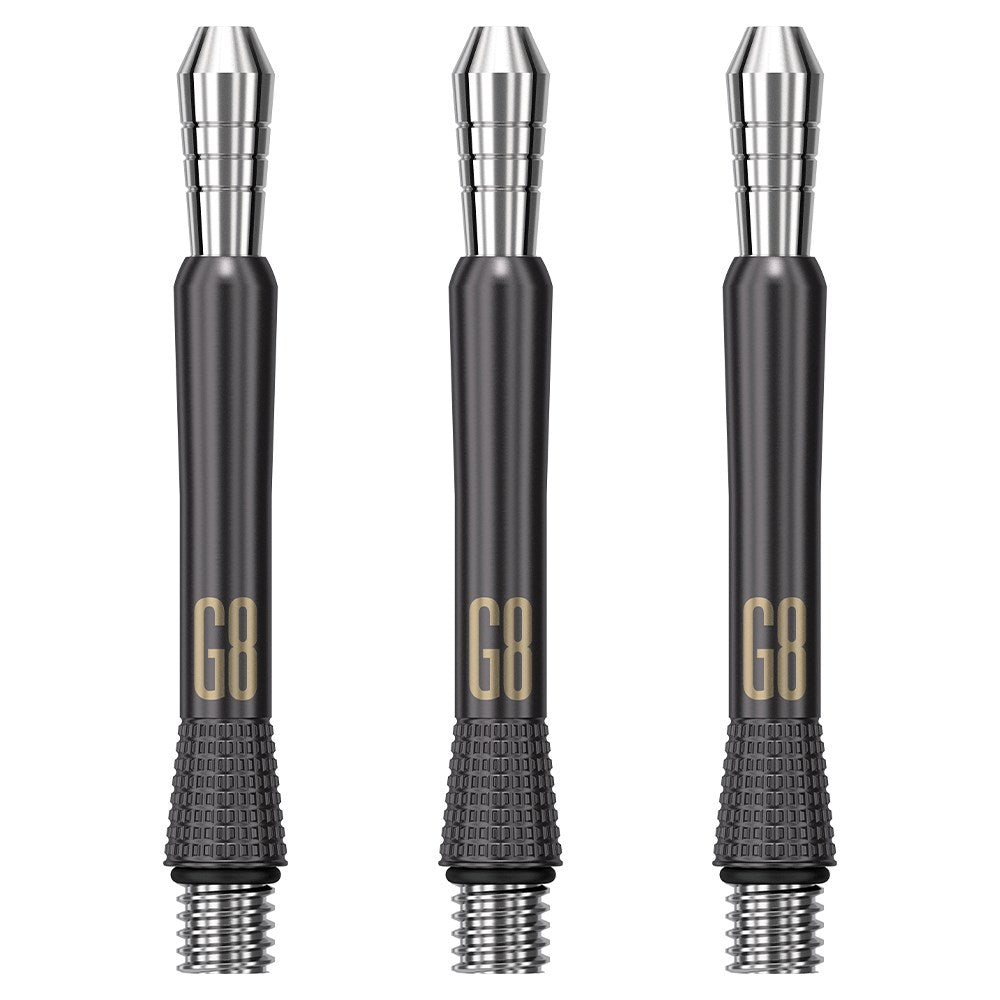 The Generation 8 Phil Taylor titanium shaft featuring intricate CNC milling, matte black performance coating and aluminium top to allow grip and ease when replacing your flight.
