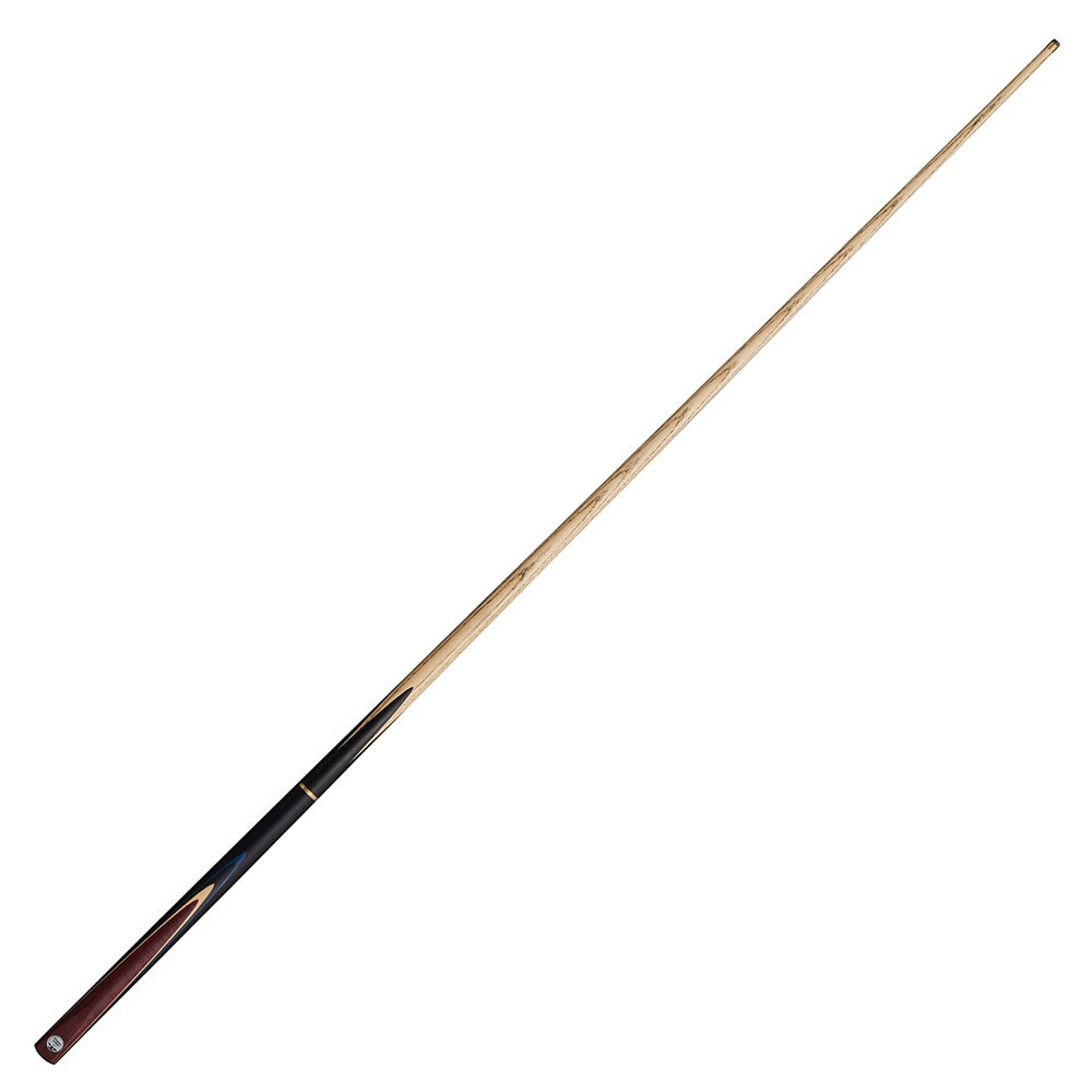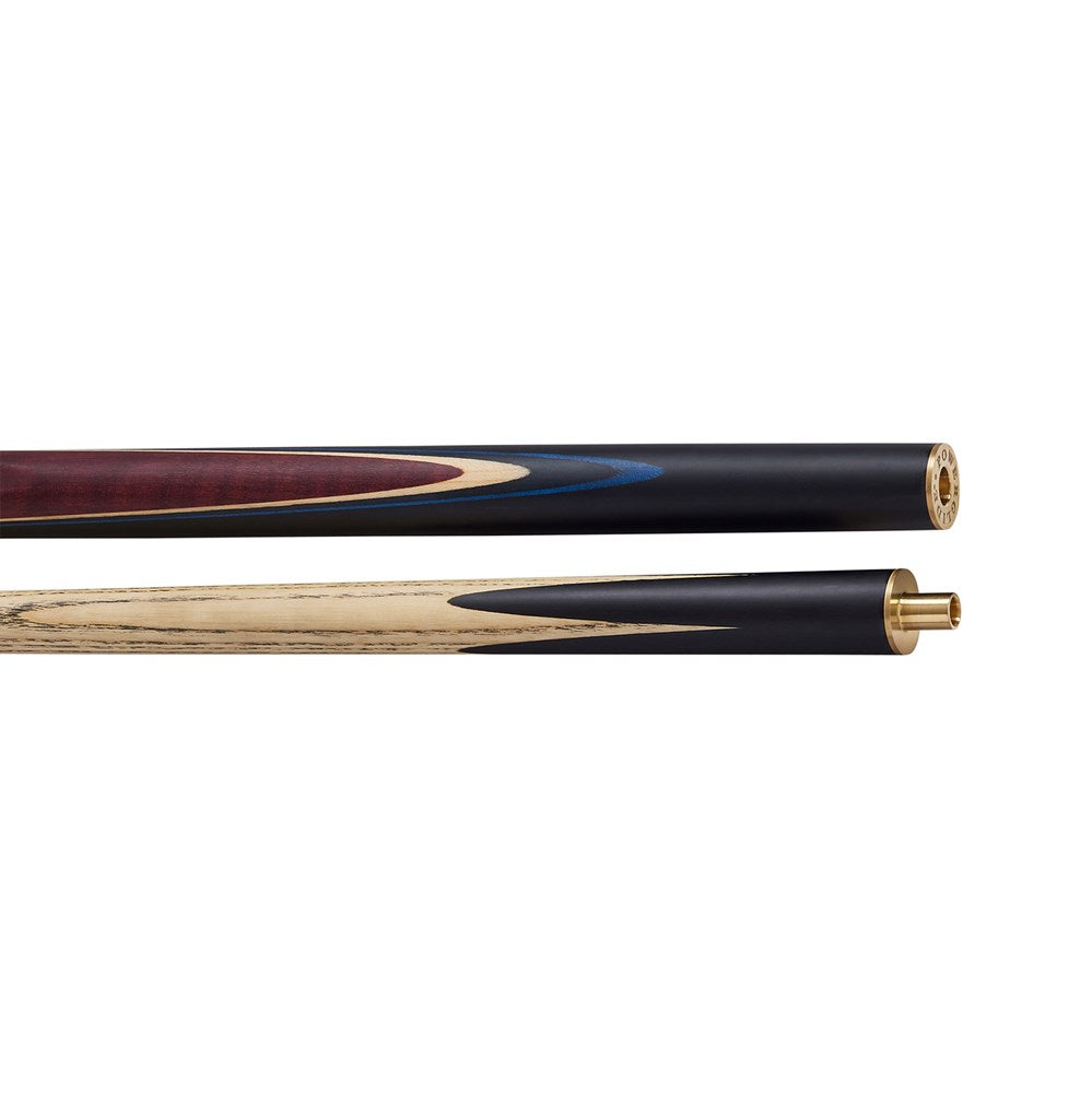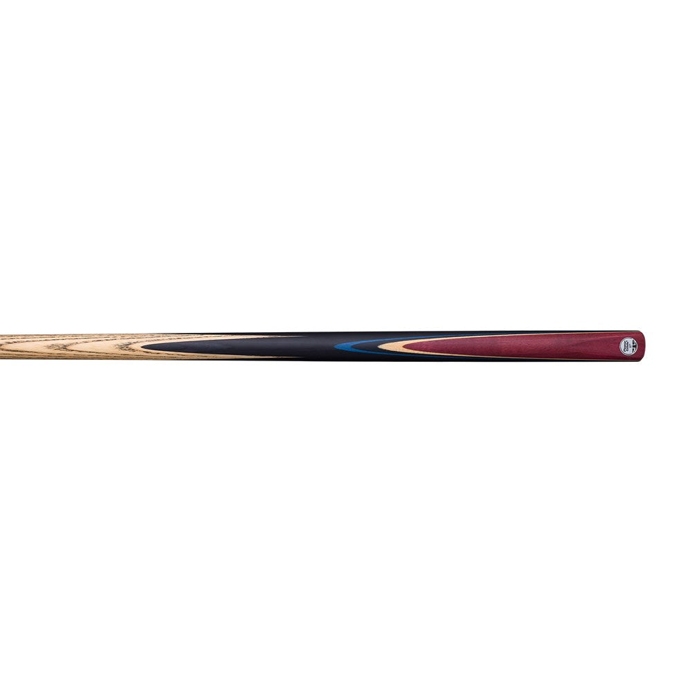 The hand-spliced butt features an Ebony front splice finished with Maple and striking blue wood veneers, along with an enamelled metal nameplate for a professional look. Fitted with a 9.5mm leather tip, this cue ensures excellent cue ball control.