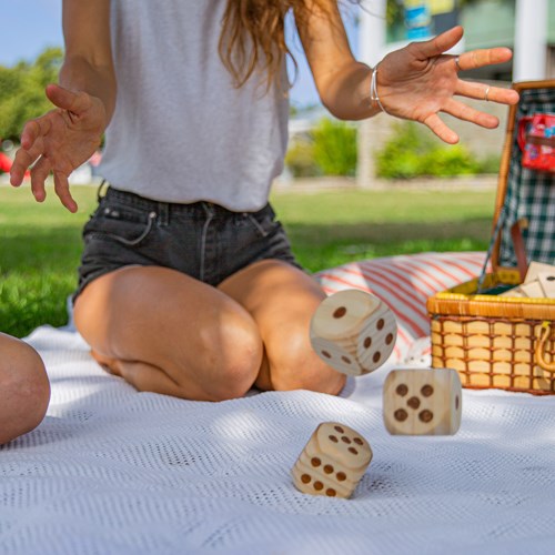 Now you can play the classic dice game Yatzy outdoors! The oversized wooden dice make it easy to play without losing them.